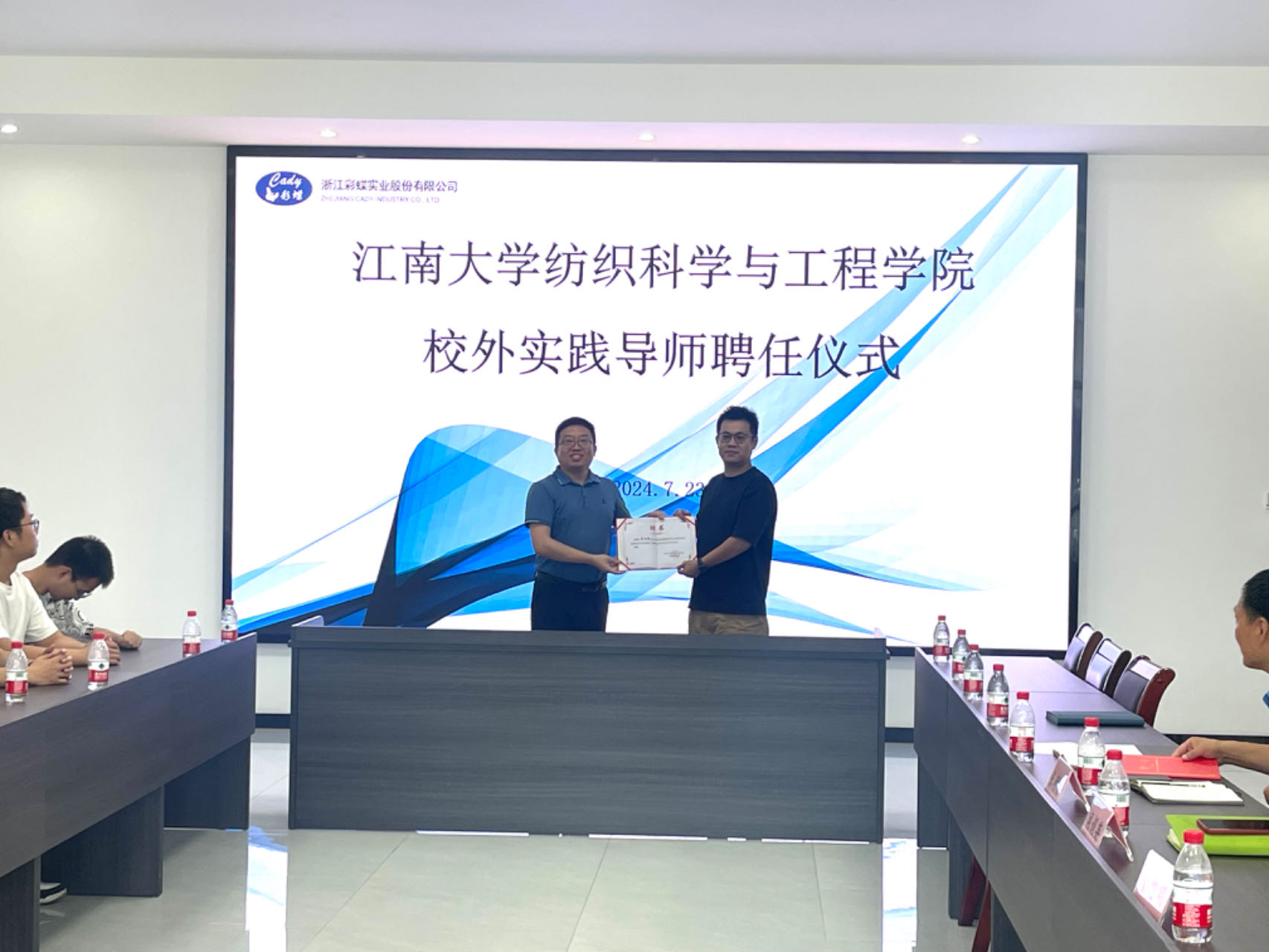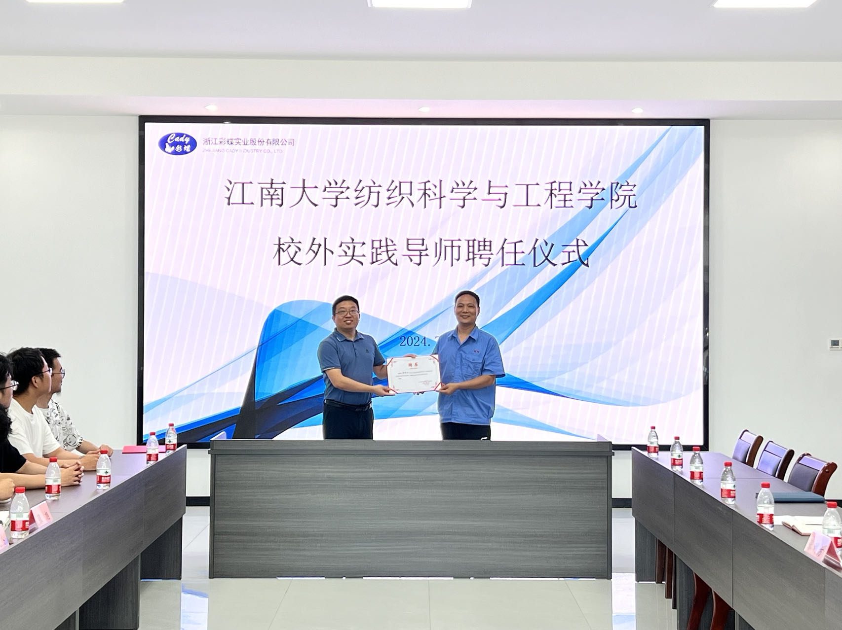 杨莉勤介绍了学院近年来的发展历程以及人才培养、就业实习情况,希望以此次交流为契机,双方保持良性互动,探索构建校企“双向赋能”育人新格局。殷允杰回顾了双方产学研合作历程,期待未来双方能在课题研究、人才交流、成果落地等更多领域开展深度合作。最后,杨莉勤向企业颁授江南大学“校外教学实习基地”和“大学生就业最佳合作伙伴”铭牌。殷允杰为织造分厂厂长董旭明和染整分厂厂长张利方颁发“校外实践导师”聘书。