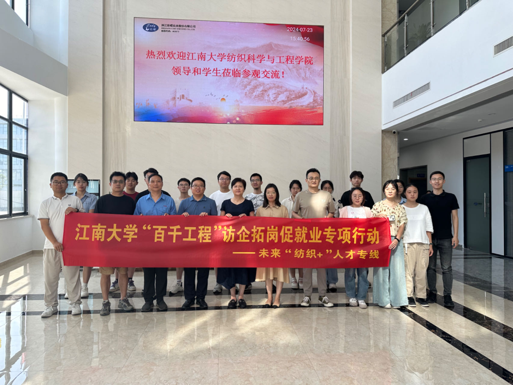 7月23日,纺织科学与工程学院前往浙江彩蝶实业股份有限公司开展“百千工程”访企拓岗促就业专项行动。学院党委副书记、副院长杨莉勤,轻化工程系主任殷允杰,辅导员伍胤鸿、张旭及2025届毕业生代表参加活动。浙江彩蝶实业股份有限公司副总经理闻娟英、人事主任朱宏霞和销售经理董旭丽热情接待。