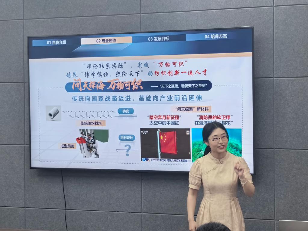 李蔚就专业定位和培养方案向参会师生进行了汇报,并分享了往届优秀学生代表的学习经验和案例,鼓励学生将个人兴趣与国家战略需求、科技进步前沿相结合,成为推动纺织“问天探海、万物可织”新质生产力。