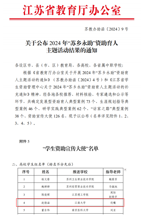 近日,江苏省教育厅公布了2024年“苏乡永助”资助育人主题活动评选结果,纺织科学与工程学院2022级本科生赵勃涵同学获“学生资助宣传大使”荣誉称号。