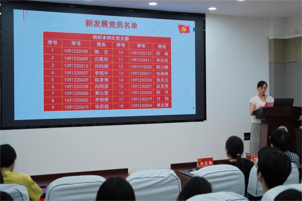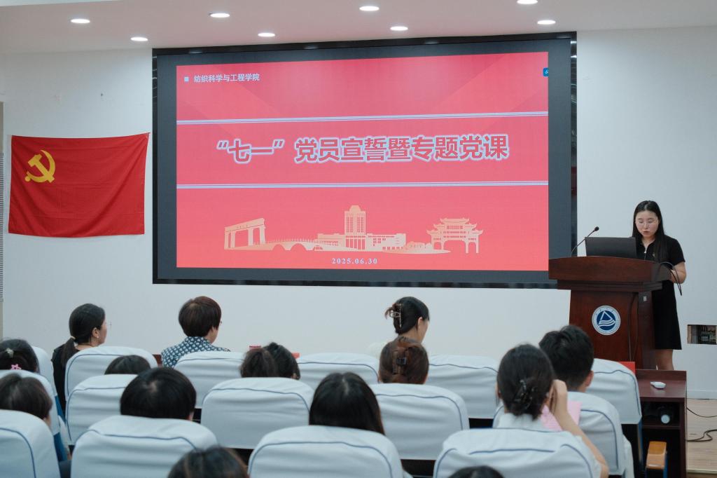 6月30日下午,纺织科学与工程学院在A103会议室举行“七一”入党宣誓仪式暨专题党课。学院党委书记张菁燕、党委副书记兼副院长杨莉勤、专职组织员张志新、党建辅导员孙婷婷以及新发展学生党员参加活动。